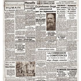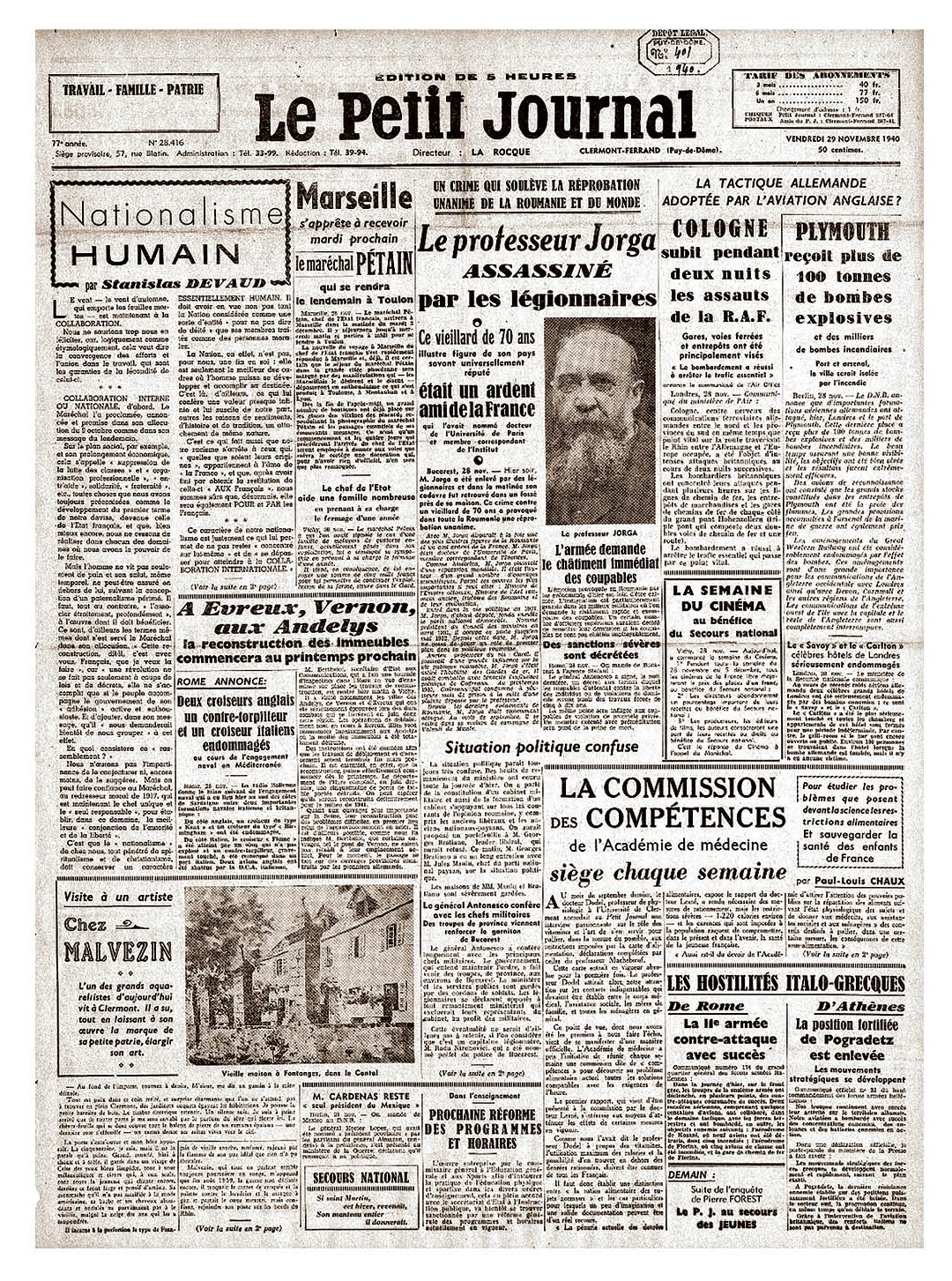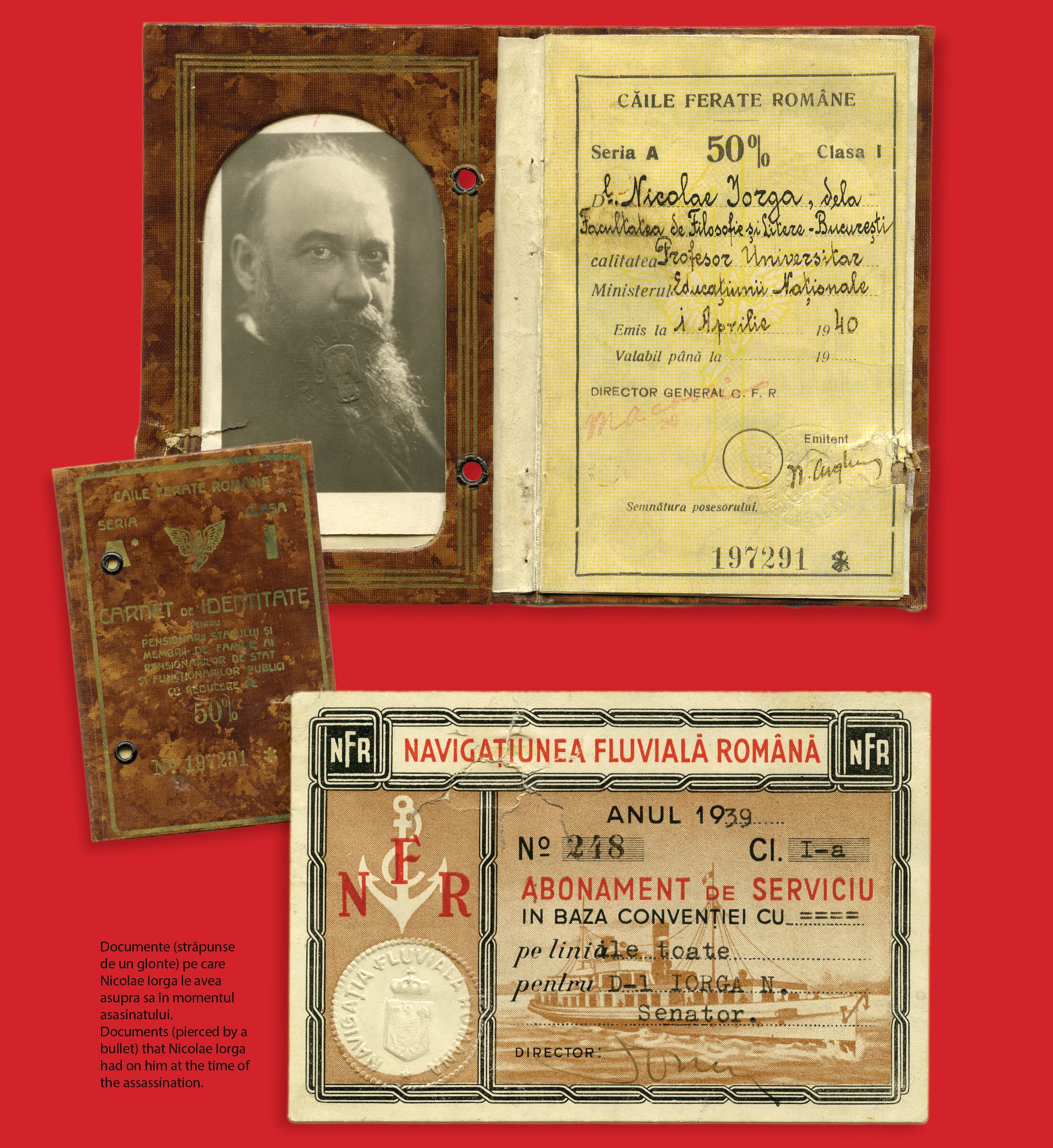 „Le professeur Nicolas Jorga a été assassiné cette nuit. Enlevè à 17 heures de son domicile à Sinaia par huit légionnaires, le professeur a été exécuté par la suite. Son cadavre retrouvé dans un fossé près de sa maison, est actuellment au cimitière Bellou, à Bucarest; il porte la trace de nombreuses balles. Cet assassinat a provoqué une émotion considerable en Roumanie […] Avec M. Jorga disparait à la fois une des plus illustres figures e la Roumanie et un ami ardent de la France. […] Comme historien, M. Jorga jouissait d`une réputation mondiale”.