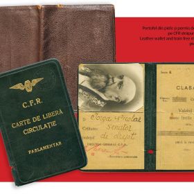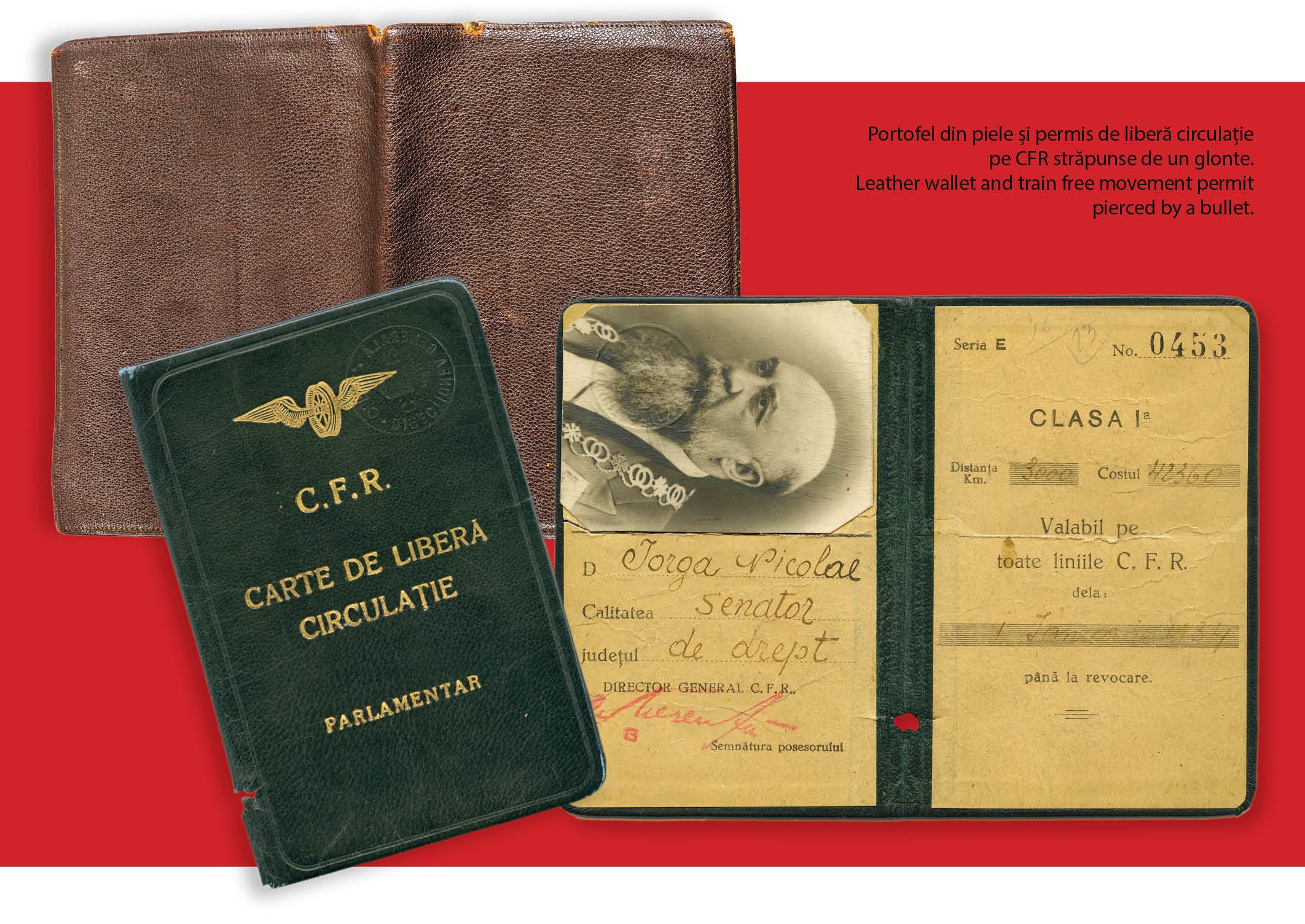 Primul dintre documente, ce are numărul de inventar 67603, este o Carte de liberă circulaţie pe C.F.R., în calitate de parlamentar, cu coperte de piele neagră, imprimate cu litere aurii și însemnul C.F.R. din acei ani – o roată de tren cu două aripi. În interior, pe pagina stângă, se află o fotografie a lui N. Iorga, în costum de gală și purtând colanul Ordinului Ferdinand, fotografie poziționată cu înclinare spre dreapta, peste care s-a aplicat un timbru sec. Textul aflat pe pagina stângă este „D. Nicolae Iorga, senator de drept” și poartă semnătura directorului general C.F.R., cu cerneală roșie. Pe pagina dreaptă se află inscripționate: „seria E nr. 0453, clasa I-a, distanţa în kilometri 3000, costul 42 360 lei, valabil pe toate liniile C.F.R., de la 1 ianuarie 1934 până la revocare”. Cotorul din piele neagră este găurit de unul dintre gloanțele care l-au omorât pe profesor.
