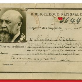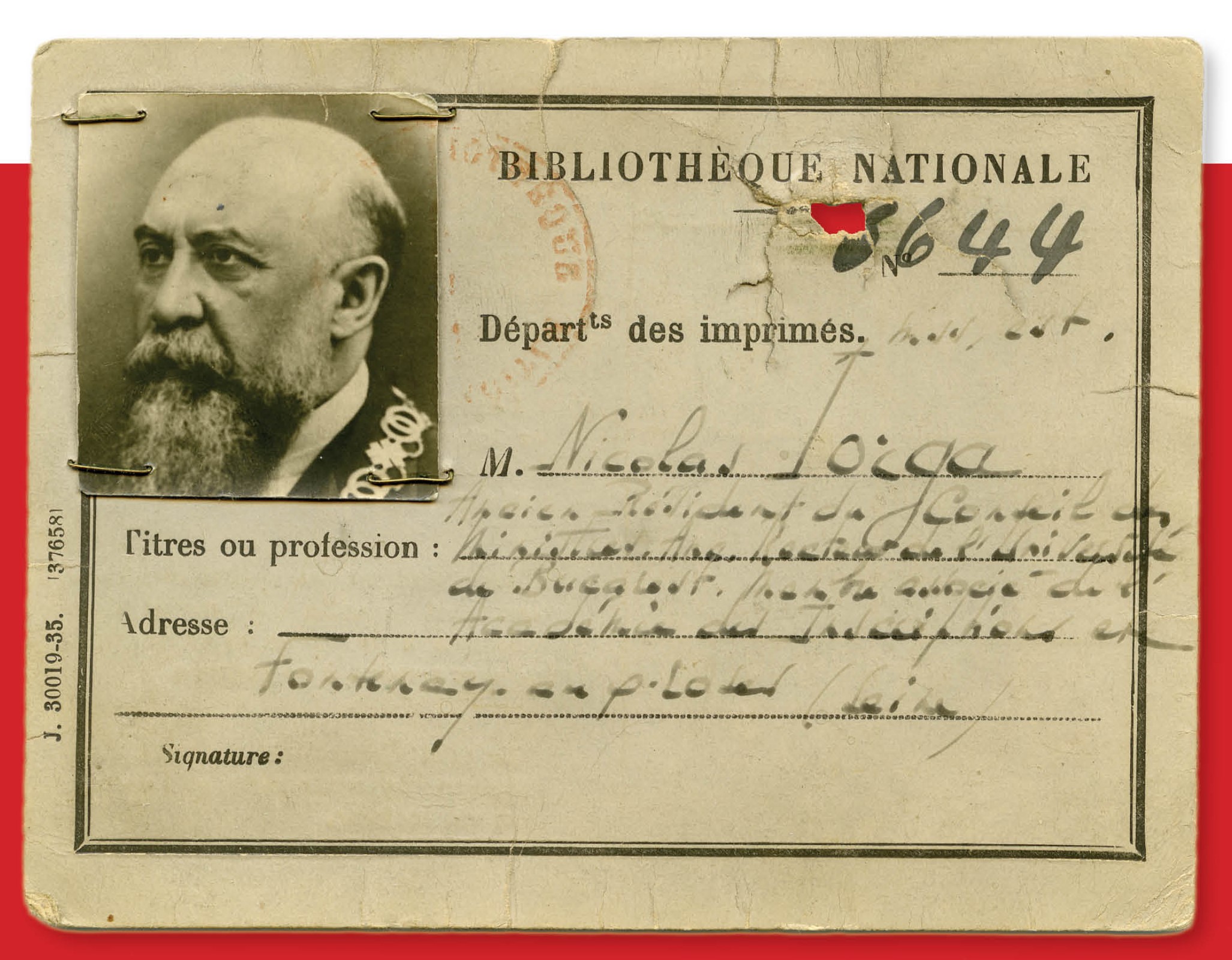 Alături de aceste permise se afla și permisul de intrare la Biblioteca Națională din Paris (nr. inv. 67606). În partea stângă are o fotografie alb-negru, prinsă în colțuri cu cleme metalice, identică cu cea de pe Cartea de liberă circulație C.F.R. (N. Iorga purtând Colanul Ferdinand), peste care a fost aplicată o ștampilă roșie. Cu tuș negru au fost completate: profesia „Ancien Président du Conseil des Ministres: Anc. Recteur de l`Université e Bucarest, membre associé de l`Academie de [indescifrabil]”. Pe spatele permisului apar viza pentru anul 1936 și instrucțiuni pentru cititori, iar lateral, stânga, este găurit de glonț.