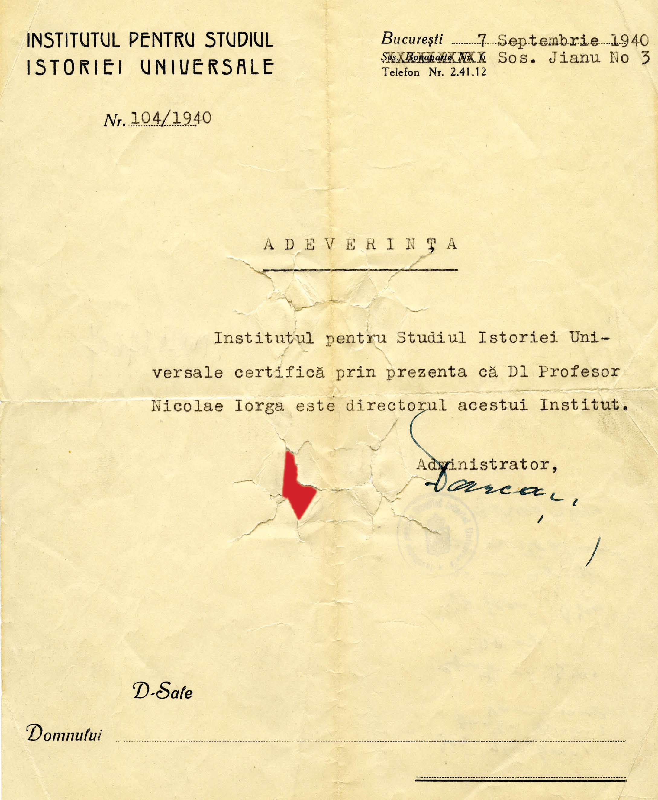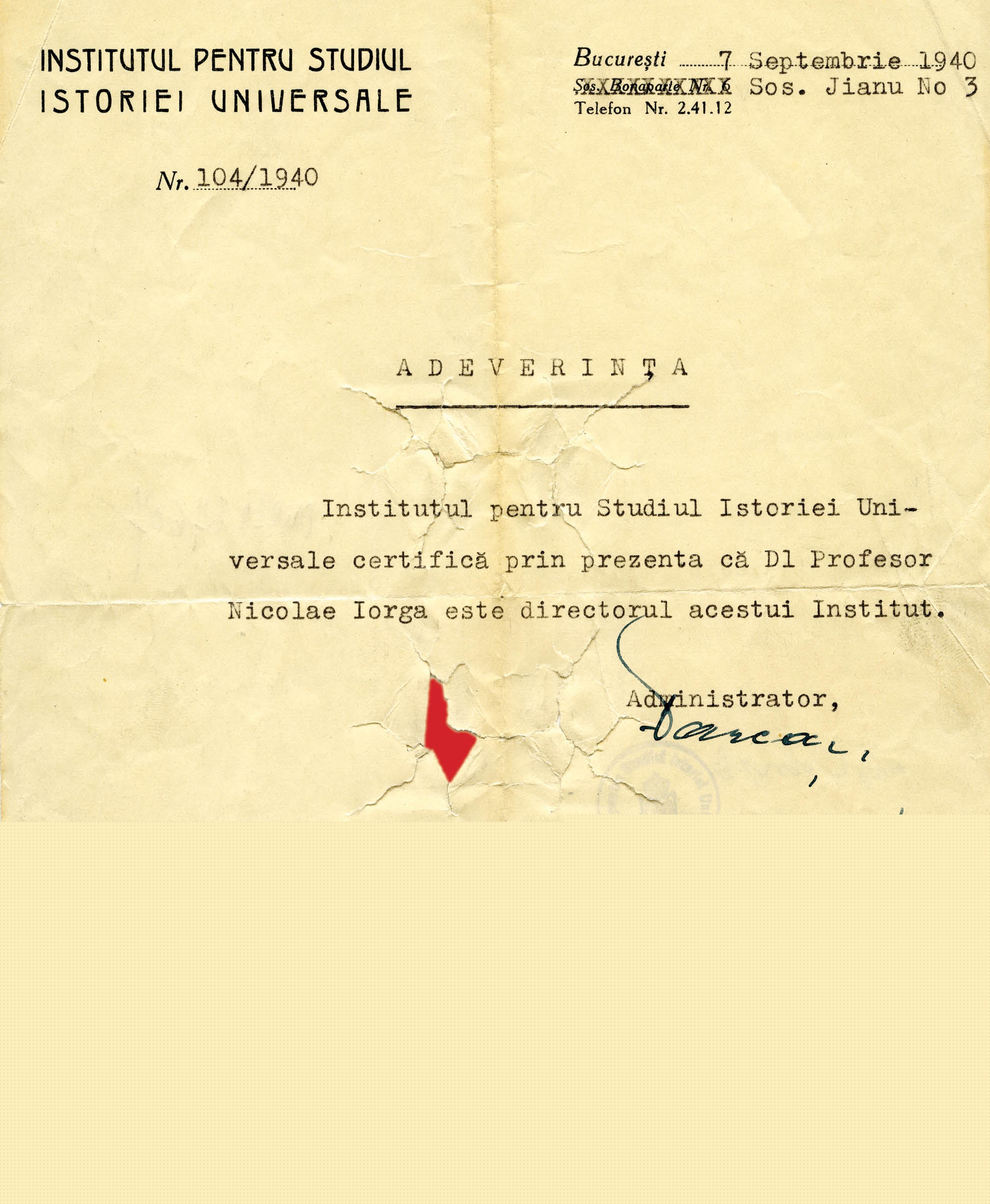 Ultimul document este o Adeverință (nr. inv. 67607) eliberată de „Institutul pentru Studiul Istoriei Universale, cu nr. 104/1940, din 7 septembrie 1940, Şoseaua Jianu, nr. 3”, din care rezultă că Nicolae Iorga era directorul acestui institut, fiind semnată de administrator. Pe verso, documentul are câteva însemnări făcute cu creionul de N. Iorga. Hârtia a fost străpunsă de gloanţe, având o bucată lipsă.