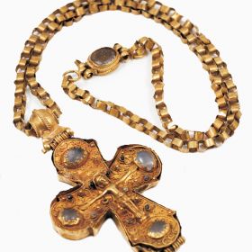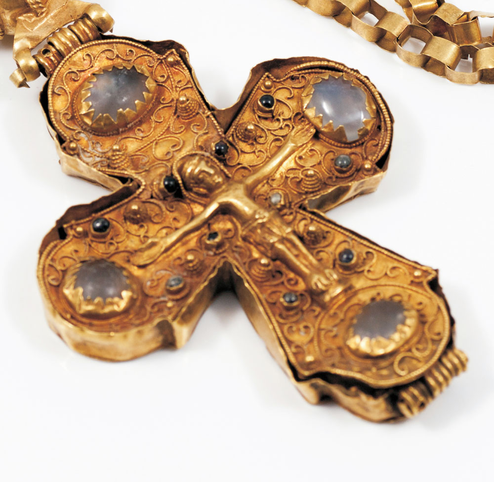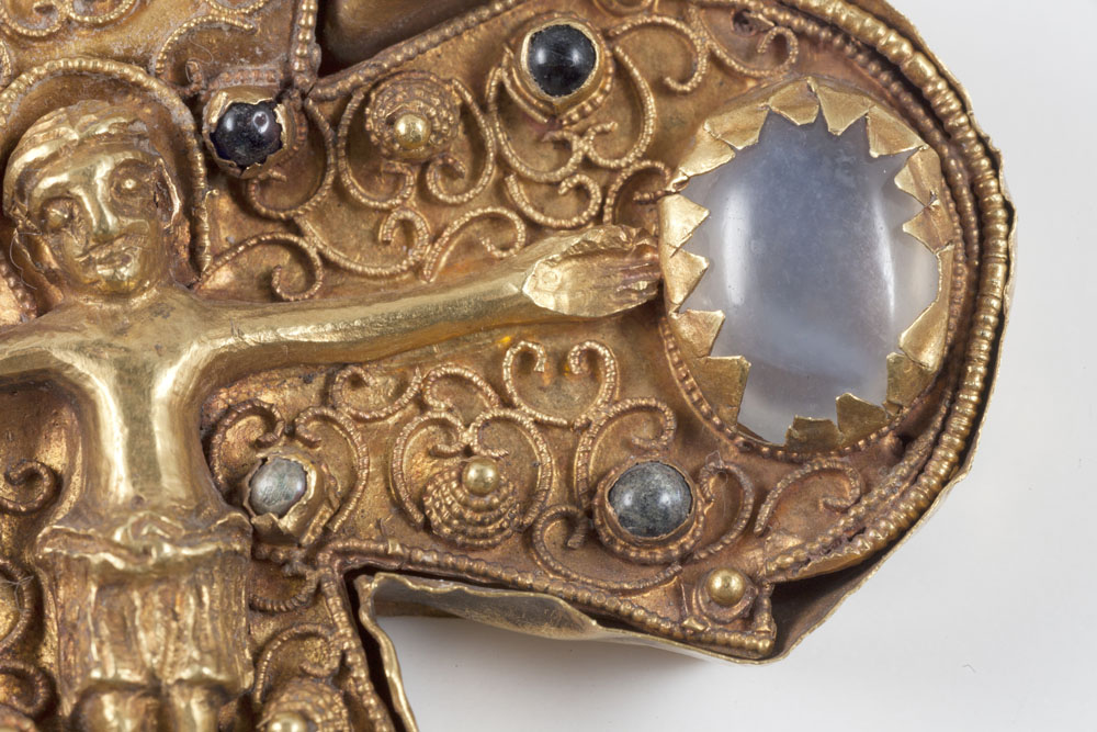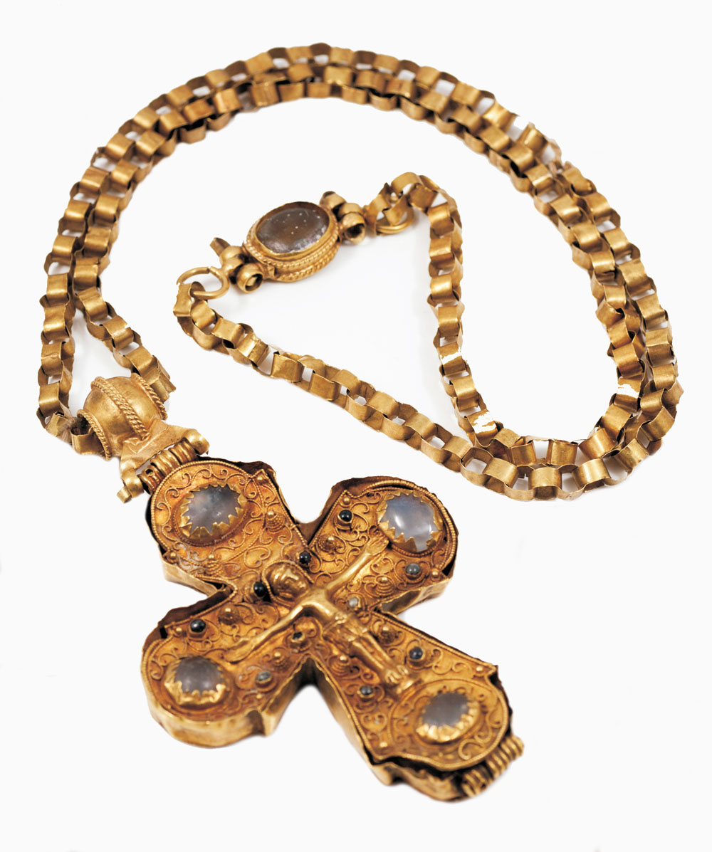 În anul 1950, anul descoperirii crucii relicvar de aur, principalele obiective ale cercetărilor arheologice de la Dinogetia au fost studierea așezării „feudale timpurii” identificată deja din campaniile anterioare, așezare evidențiată pe atunci „prin apariția pentru prima dată în săpăturile din România, a unui complex de bordeie și locuințe din secolele IX-XII”. Crucea relicvar a fost descoperită în groapa „z” din suprafața A. În umplutura gropii adâncite în nivelul romano-bizantin s-a găsit „o mare cantitate de oase și de solzi de pește, cenușă, cioburi de vase de tip slav, cioburi cu smalț, fragmente de brățări de sticlă, o monedă de bronz [...] din sec. al XI-lea precum și o cruce de aur de purtat pe piept, (engolpion) cu lanțul său.” Contextul, datat în secolul al XI-lea, a fost interpretat drept „groapă de gunoi”.