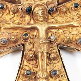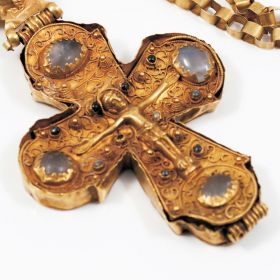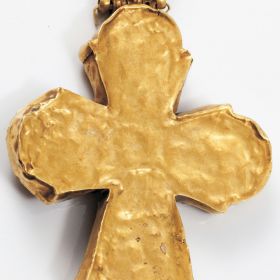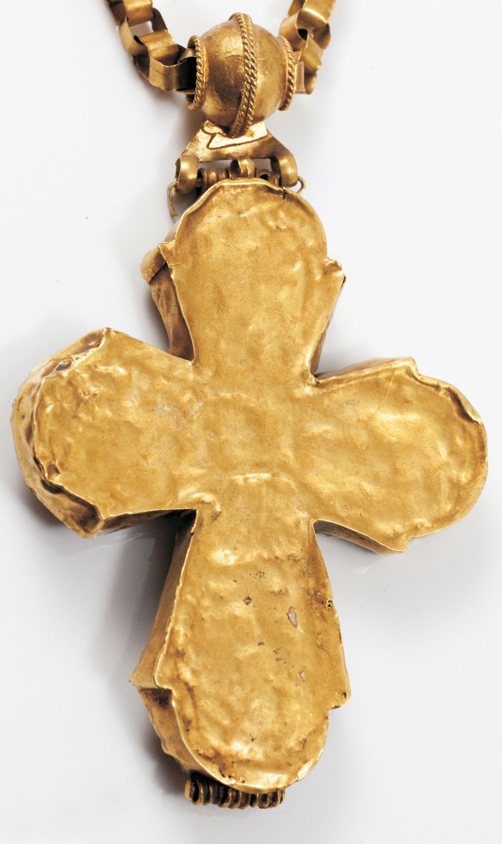 În formă de cruce latină, cu brațele ușor evazate și rotunjite spre extremități, crucea relicvar de la Dinogetia este compusă din două jumătăți articulate longitudinal prin intermediul a două balamale. Partea din față, puțin mai mică, este cuprinsă de cea din spate și îmbinate formează împreună o casetă. În interiorul acesteia se păstrează o bucățică de pânză fină de mătase, în care e înfășurată o mică relicvă. Cele două jumătăți sunt lucrate din foaie de aur, cea din spate este simplă, neornamentată. Fața superioară este mărginită de un fir perlat și în mijloc este aplicată o statuetă miniaturală cu Iisus răstignit. La extremitățile brațelor este montată câte o piatră ornamentală translucidă – sau o pastilă din pastă de sticlă – șlefuită în caboșon, casetele în care sunt fixate având marginile dințate și îndoite spre interior peste pietre. De-a lungul laturilor brațelor sunt aplicate alternativ conuri formate din sârmă răsucită în vârf cu câte o perluță de aur și mici casete circulare în care sunt montate pietre ornamentale sferice (sau pastile din pastă de sticlă). Pe brațul superior, cele din urmă lipsesc. La baza arcelor de la capetele brațelor este aplicată câte o granulă din aur înconjurată de câte un fir din aur răsucit. În partea superioară este sudată o perlă bitronconică prin care este petrecut un lanț cu 174 de zale dreptunghiulare realizate dintr-o bandă îngustă de aur. Cu toate că lanțul este suficient de lung pentru a putea fi pus direct în jurul gâtului și crucea suspenda la nivelul pieptului, acesta a fost totuși prevăzut cu un fel de sistem de închidere al cărui rol era probabil mai mult decorativ. Acesta se compune dintr-o casetă ovală în care este montată o piatră translucidă (sau o pastilă din pastă de sticlă) șlefuită în caboșon, legătura cu lanțul realizându-se tot prin intermediul unor verigi îmbinate după modelul balamalelor, unitatea ansamblului fiind asigurată de câte un ax transversal. Crucea are o lungime de 10,2 cm, o lățime de 6,30 cm și o greutate împreună cu lanțul de 77,27 g.