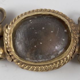 L=10,2 cm; l=6,30 cm; Gr=0,59 cm; L lanţ=70 cm; G=77,27 g; Calcedonia=3,35 kt